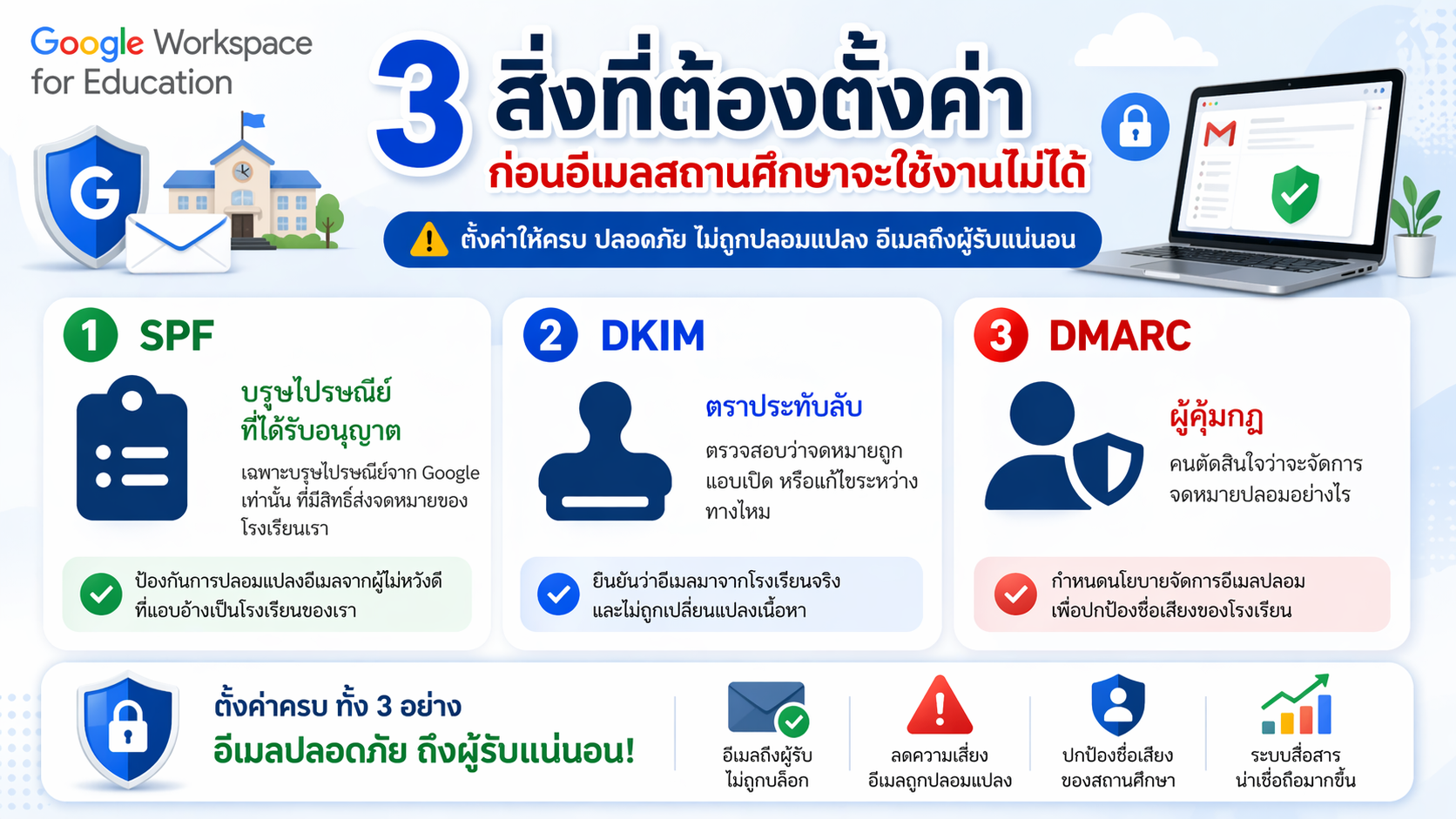 ในช่วงหลายเดือนที่ผ่านมา Google ประกาศบังคับใช้มาตรฐานการยืนยันตัวผู้ส่งอีเมลอย่างเข้มงวดขึ้น สถานศึกษาหลายแห่งที่ใช้ Google Workspace for Education เริ่มเจอปัญหาอีเมลที่ส่งจากโดเมนโรงเรียนถูกตีกลับ ถูกจัดเป็นสแปม หรือส่งไม่ถึงผู้รับเลย ปัญหานี้ไม่ได้เกิดจาก Google แต่เกิดจากการที่โดเมนของโรงเรียนยังไม่ได้ตั้งค่า SPF, DKIM และ DMARC ให้ครบถ้วน บทความนี้จะอธิบายทั้ง 3 เรื่องนี้แบบเข้าใจง่าย พร้อมขั้นตอนตั้งค่าที่ผู้ดูแลระบบของโรงเรียนหรืออาชีวศึกษาทำตามได้ทันที ทำไมอีเมลสถานศึกษาถึงถูกบล็อกหรือตีกลับ? ลองนึกภาพว่ามีคนแอบอ้างชื่อโรงเรียนของเราไปส่งอีเมลหลอกลวง ผู้รับจะเชื่อหรือไม่ว่านั่นคืออีเมลจริงจากเรา? ระบบอีเมลปลายทางอย่าง Gmail, Outlook, Yahoo จึงต้องการ “หลักฐาน” ว่าอีเมลที่อ้างว่ามาจาก @yourschool.ac.th ถูกส่งจากเซิร์ฟเวอร์ที่โรงเรียนอนุญาตจริง และเนื้อหาไม่ถูกแก้ไขระหว่างทาง หลักฐานนั้นมาในรูปแบบของ DNS record 3 ตัวที่ทำงานร่วมกัน คือ SPF, DKIM และ DMARC หากขาดตัวใดตัวหนึ่ง โอกาสที่อีเมลจะถูกมองว่าน่าสงสัยก็สูงขึ้นทันที ตั้งค่าครบทั้ง 3 อย่าง = อีเมลปลอดภัย ถึงผู้รับแน่นอน ลดความเสี่ยงการถูกปลอมแปลง ปกป้องชื่อเสียงของสถานศึกษา 1. SPF — ใครได้รับอนุญาตให้ส่งอีเมลในนามโรงเรียน SPF (Sender Policy Framework) คือการกำหนดว่าเซิร์ฟเวอร์ใดบ้างที่ได้รับอนุญาตให้ส่งอีเมลในนามของโดเมนโรงเรียน เปรียบเหมือน “รายชื่อบุรุษไปรษณีย์ที่ได้รับอนุญาต” — ถ้าอีเมลถูกส่งมาจาก IP ที่ไม่อยู่ในรายชื่อ ระบบปลายทางจะรู้ทันทีว่าน่าสงสัย ขั้นตอนตั้งค่า SPF เข้าสู่ระบบผู้ให้บริการ DNS ของโดเมนโรงเรียน (เช่น THNIC, Cloudflare, GoDaddy) เลือกโดเมนที่ต้องการตั้งค่า เพิ่มบันทึก TXT ใหม่ด้วยค่าต่อไปนี้: Type TXT ชื่อ/โฮสต์ @ ค่า TXT v=spf1 include:_spf.google.com ~all TTL อัตโนมัติ หรือ 3600 วินาที ข้อควรระวัง: แต่ละโดเมนมี SPF record ได้เพียง รายการเดียวเท่านั้น หากโรงเรียนใช้บริการอีเมลหลายเจ้า (เช่น Google + MailChimp) ต้องรวมไว้ในบรรทัดเดียวกันโดยใช้ include: ซ้อนกัน เช่น v=spf1 include:_spf.google.com include:servers.mcsv.net ~all 2. DKIM — ตราประทับลับที่ป้องกันการปลอมแปลงเนื้อหา DKIM (DomainKeys Identified Mail) คือการใส่ลายเซ็นดิจิทัลในอีเมลทุกฉบับที่ส่งออกจากโดเมนโรงเรียน ทำหน้าที่เป็น “ตราประทับลับ” ที่บอกผู้รับได้ 2 เรื่อง คือ อีเมลมาจากโรงเรียนจริงและเนื้อหาไม่ถูกแก้ไขระหว่างทาง ขั้นตอนตั้งค่า DKIM สำหรับ Google Workspace เข้า Google Admin Console ที่ admin.google.com ไปที่ แอป → Google Workspace → Gmail → ตรวจสอบสิทธิ์อีเมล คลิก สร้างระเบียนใหม่ เลือกความยาวบิตของคีย์ DKIM เป็น 1024 (แนะนำ) ในช่องตัวเลือกคำนำหน้า พิมพ์ google คลิก สร้าง คัดลอกค่า ชื่อโฮสต์ DNS (จะได้เป็น google._domainkey) และ ค่า TXT (ขึ้นต้น